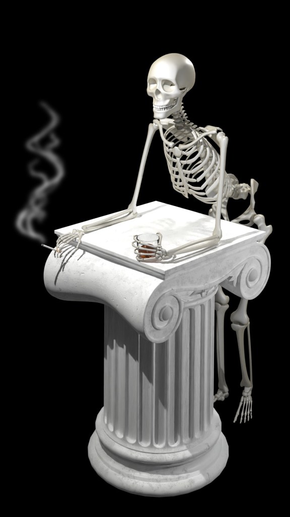 Low poly study of a skeleton leaning on a study of an Ionic Column.